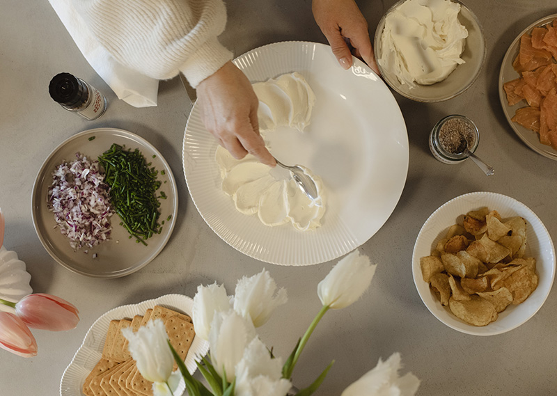 1. Spread the cream cheese onto a plate in a soft, round shape.